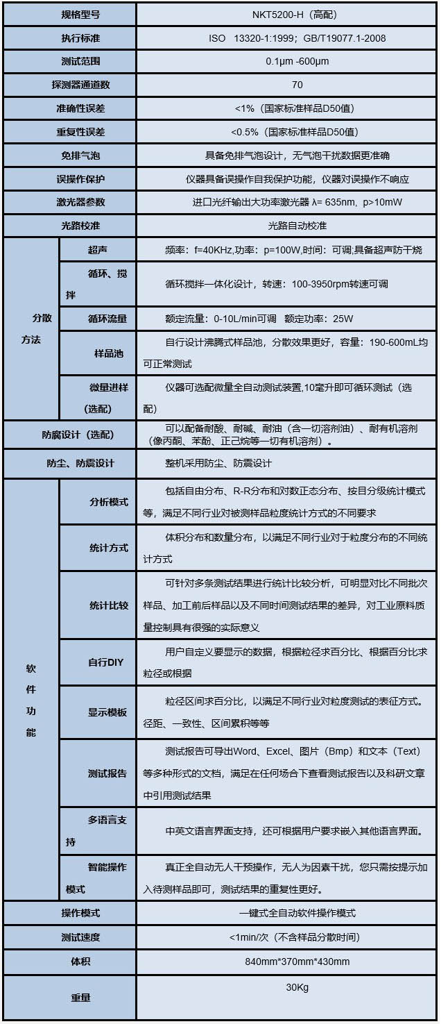NKT5200-H激光粒度分析儀主要技術參數和主要性能特點: